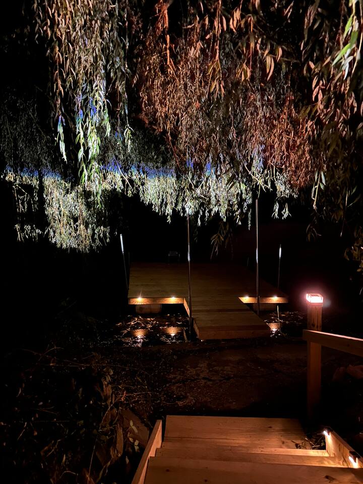 Welcome to Upstate Waterfronts! Looking for a restorative Upstate getaway? This Creekside gem has you covered. - HOT TUB! - SAUNA - 2 bedrooms/1 full bathroom - Fully equipped kitchen & high-end amenities - Private creek access - including kayaks/vests/paddles - Stunning creek views - including a water facing balcony - 3,000 Arcade games, 52'' Smart TV, endless board games - High-speed WiFi - Prime location - walkable to town/restaurants/shops/beach